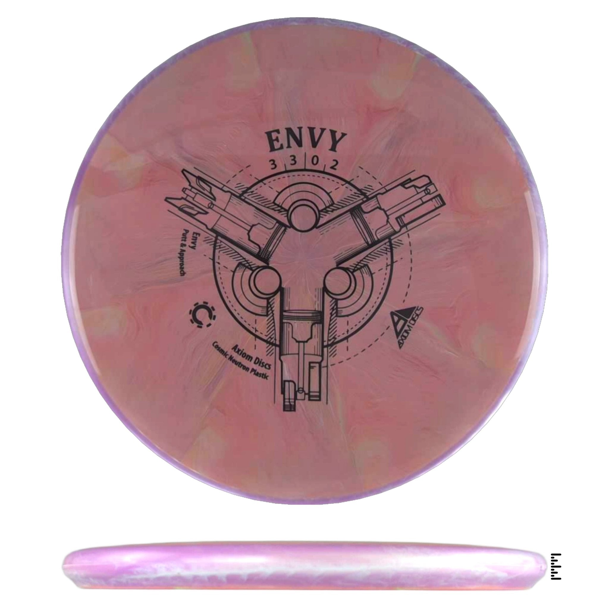 The Envy is a slightly overstable putt and approach disc. The Envy has a smooth modern feel that fits in the hand perfectly, lending confidence for both putt and approach duties. The Envy exhibits reliable high-speed stability and a minimal fade. With a slightly lower profile and cruising speed than the Ion and Anode class, the Envy is a uniquely 'lid-like' stable putter.