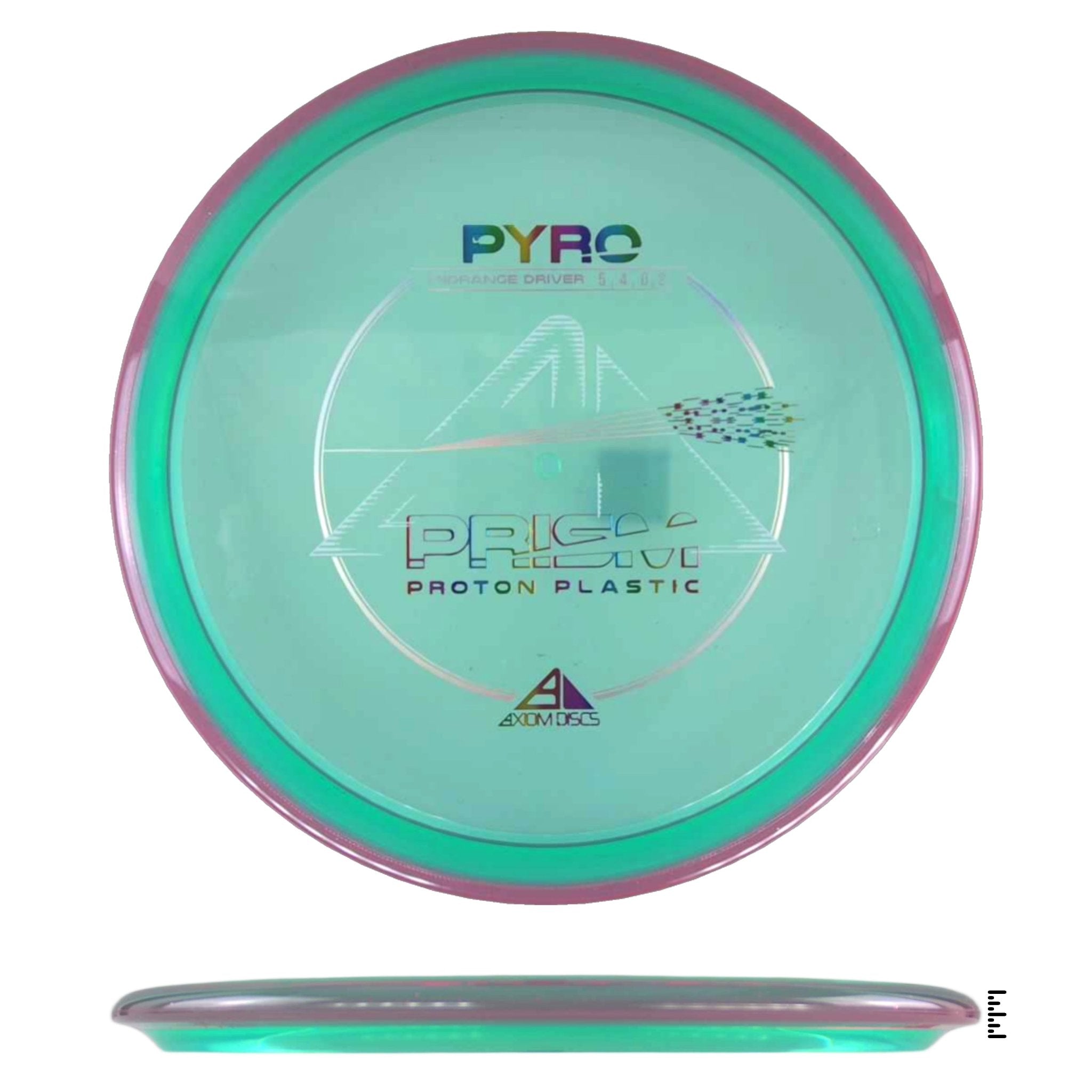 Prism Proton Pyro is Axiom’s overstable midrange! The Prism Pyro is debuting with a stock triple-foil stamp, that in combination with a Proton core and Prism rim produces a stunning dual-toned translucent disc. The Prism Proton Pyro was designed as Axiom’s first overstable Midrange with more glide than the MVP Deflector and a commanding stable finish. The Pyro has enough stability for consistent flights in strong winds and powerful throws without losing its line and turning off target. Fire away with the predictably overstable flights of the Prism Proton Pyro!