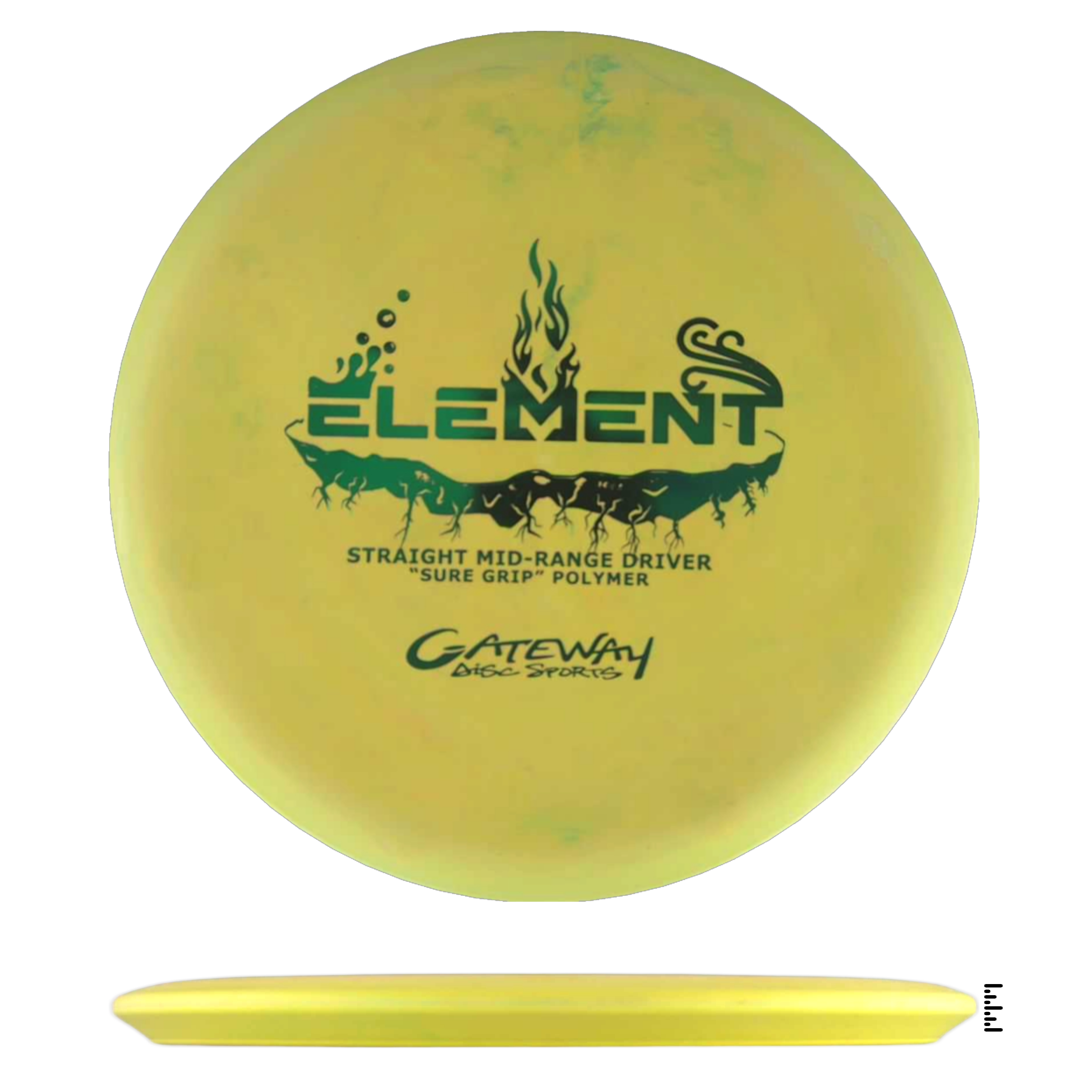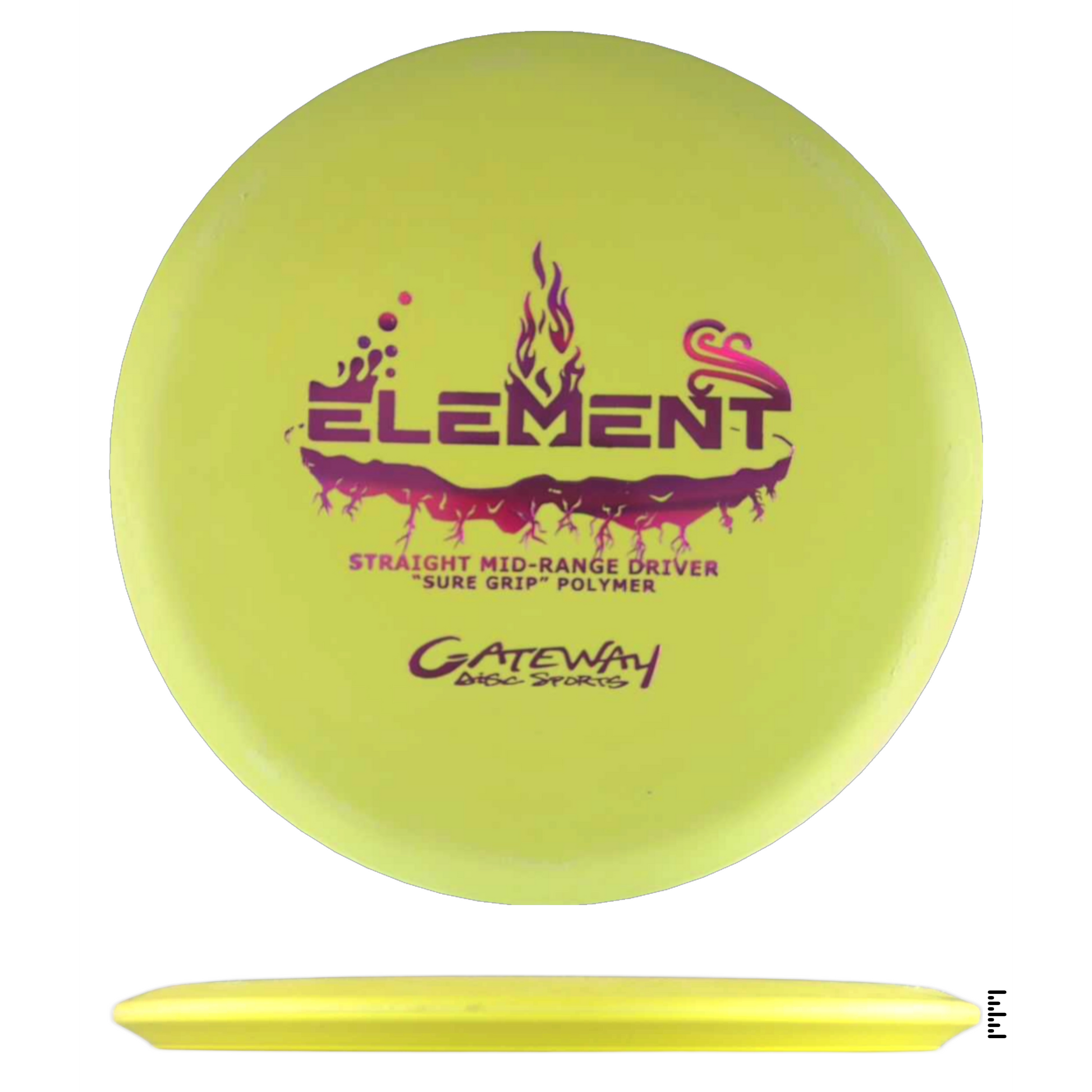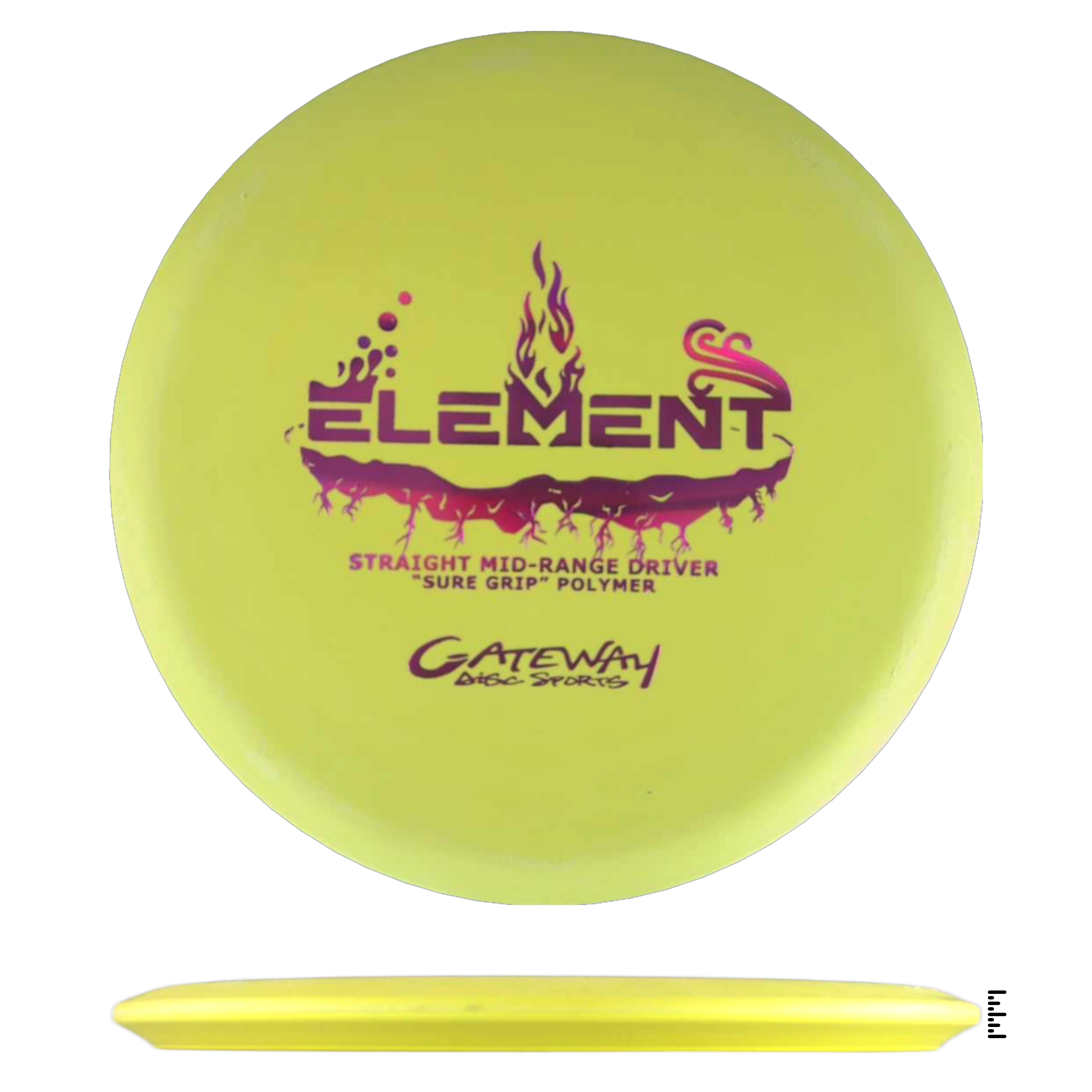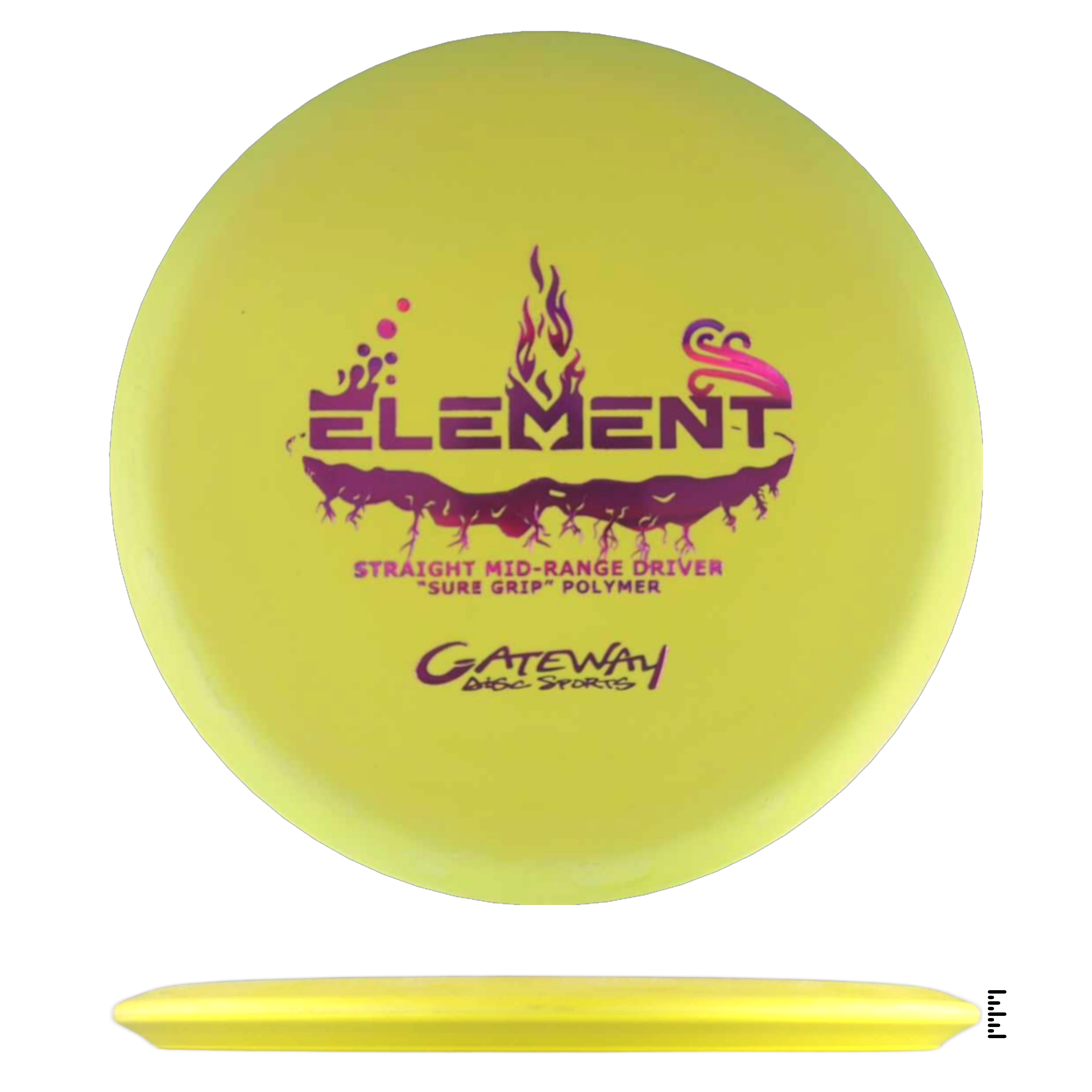 The Gateway Element is a great all around midrange disc. This disc will hold any angle you put it on with unbelievable glide. If you throw it flat it will go extremely straight will very little fade at the end of its flight. Anhyzers will keep turning, and hard-thrown hyzers will flip up to flat.