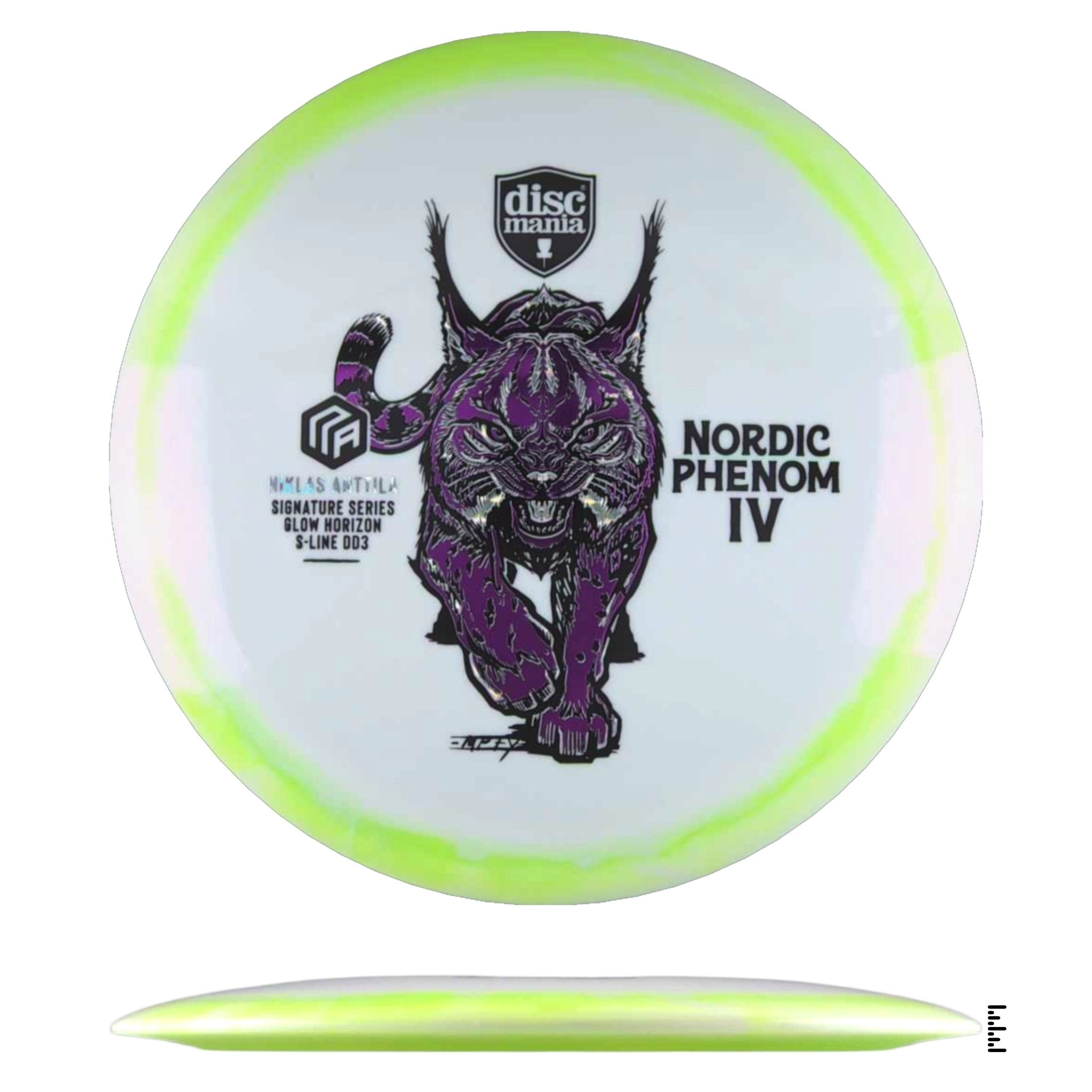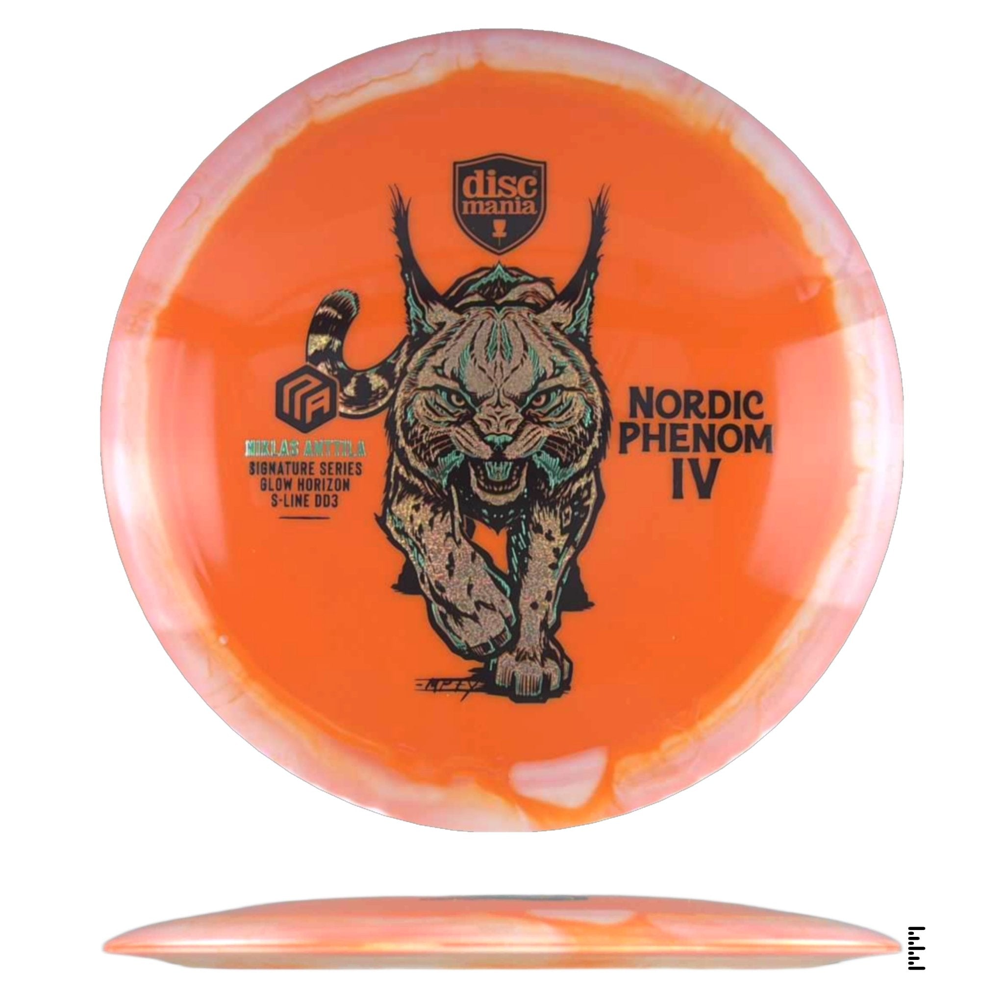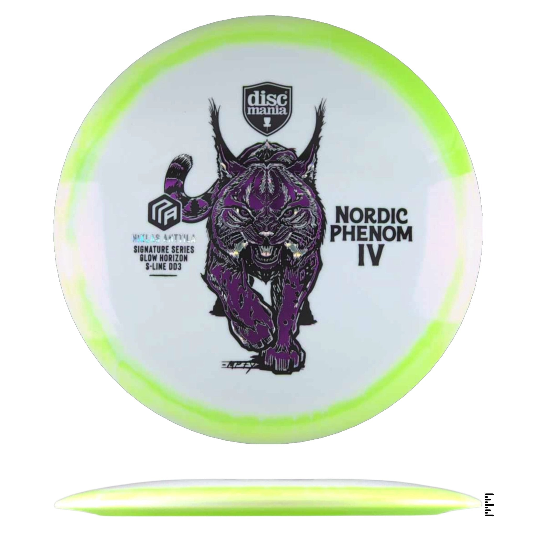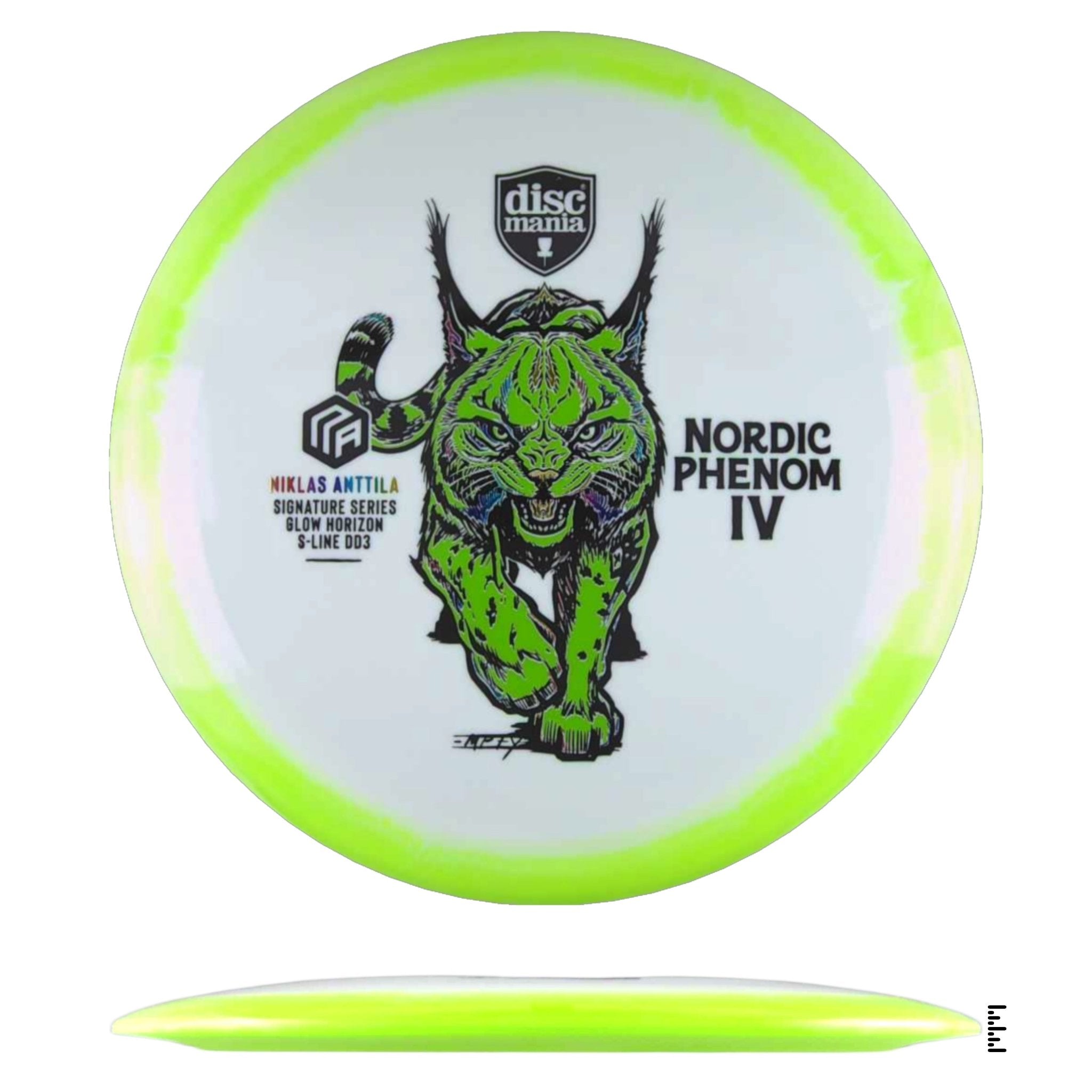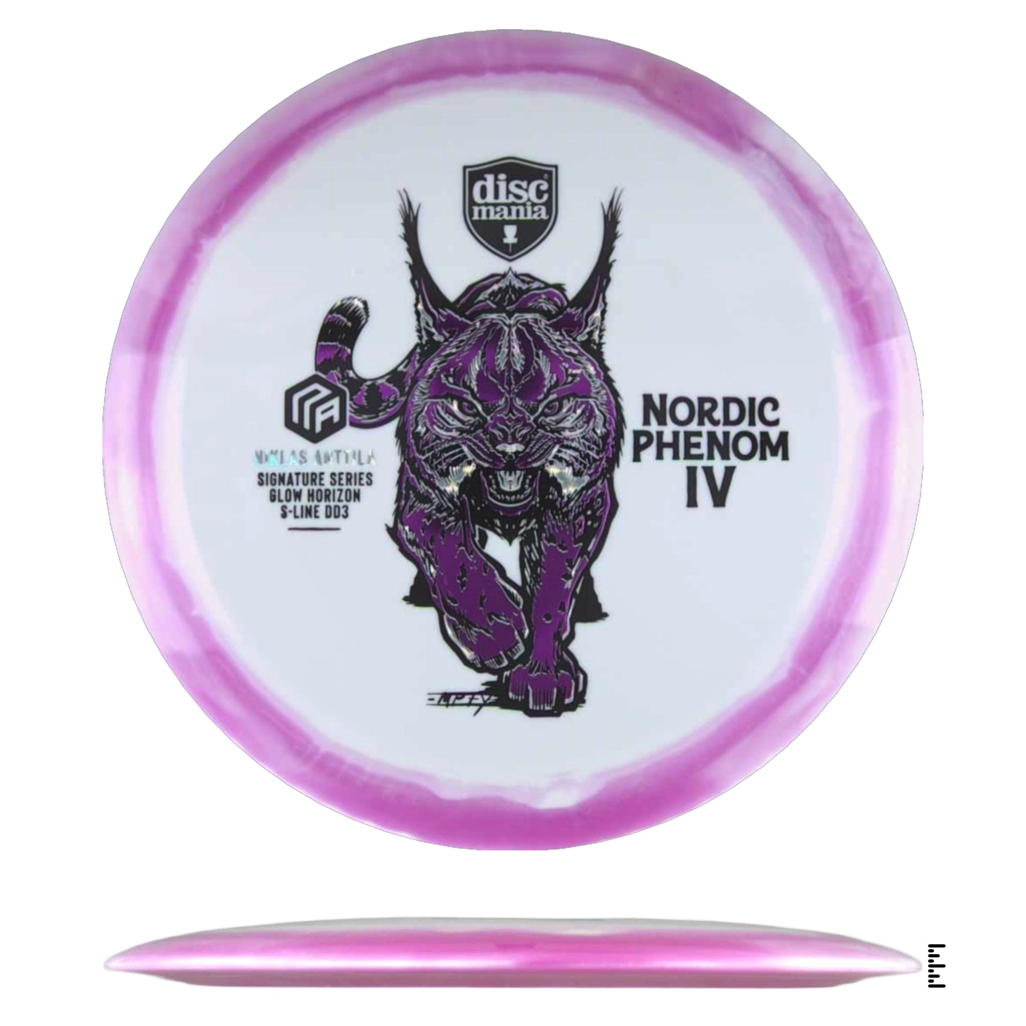 The Discmania Nordic Phenom 4 returns to the DD3 mold with a new look and an even better flight. The signature series disc for Team Discmania's Niklas Anttila, the Nordic Phenom 4 is in the new Glow Horizon S-Line blend. It has a balance of grip, stiffness, and stability. There is a slightly dome on these which helps with some glide, but keeps the stability in the flight until the very end.