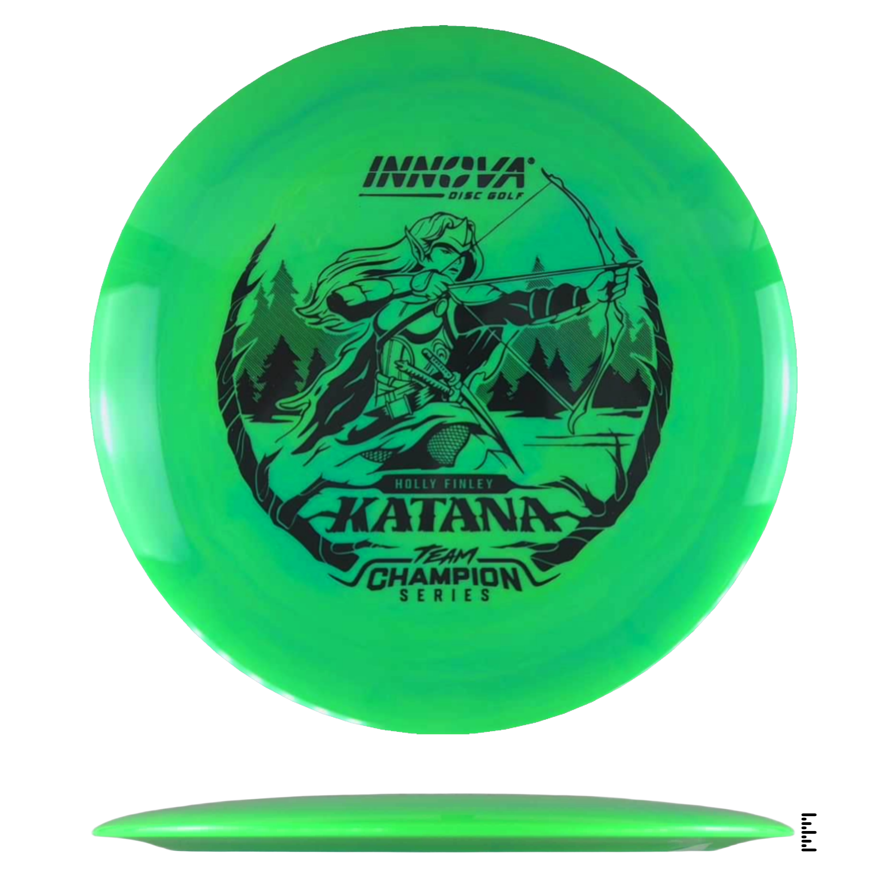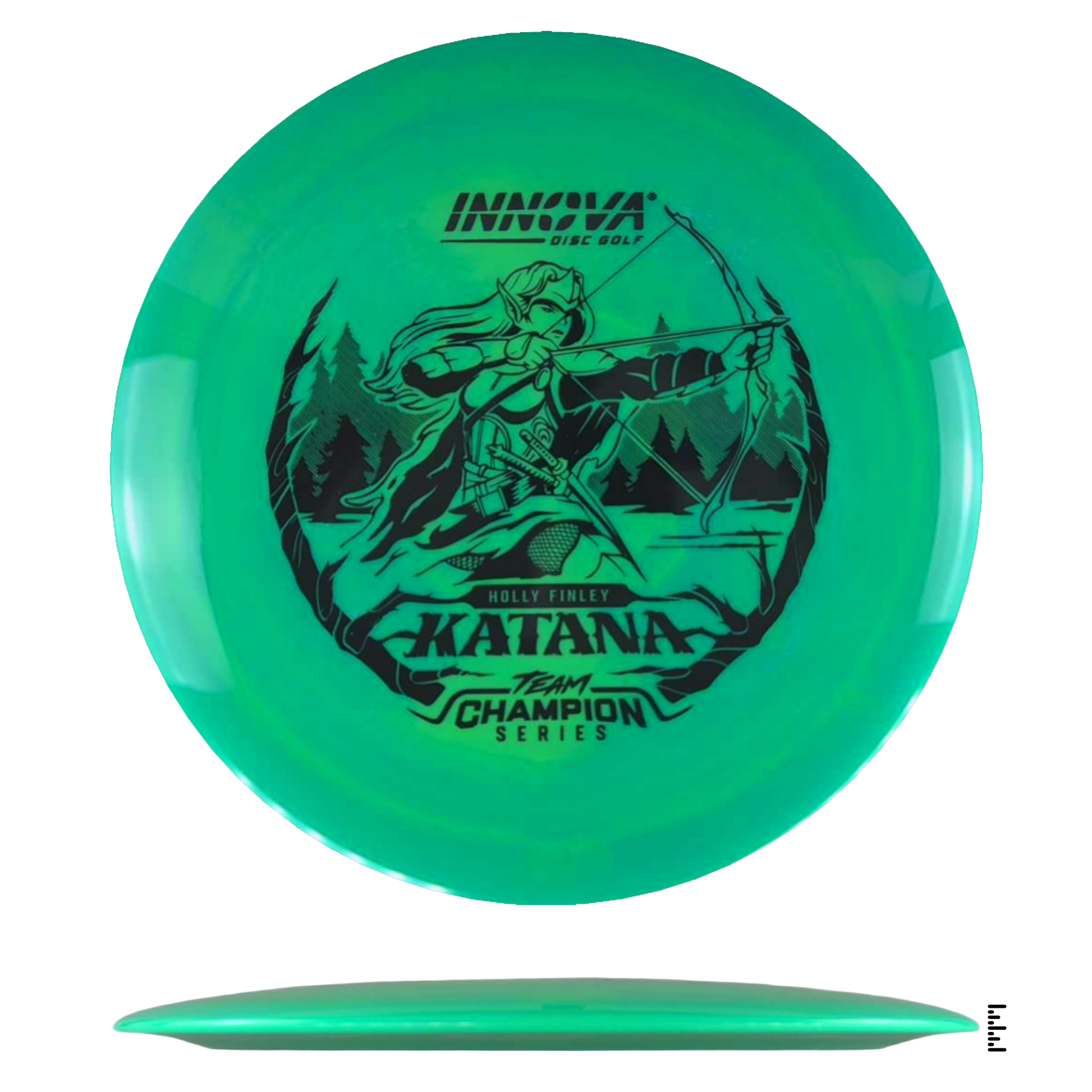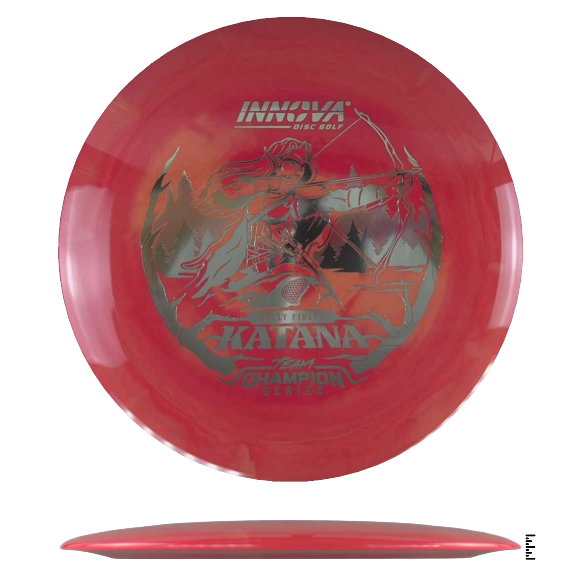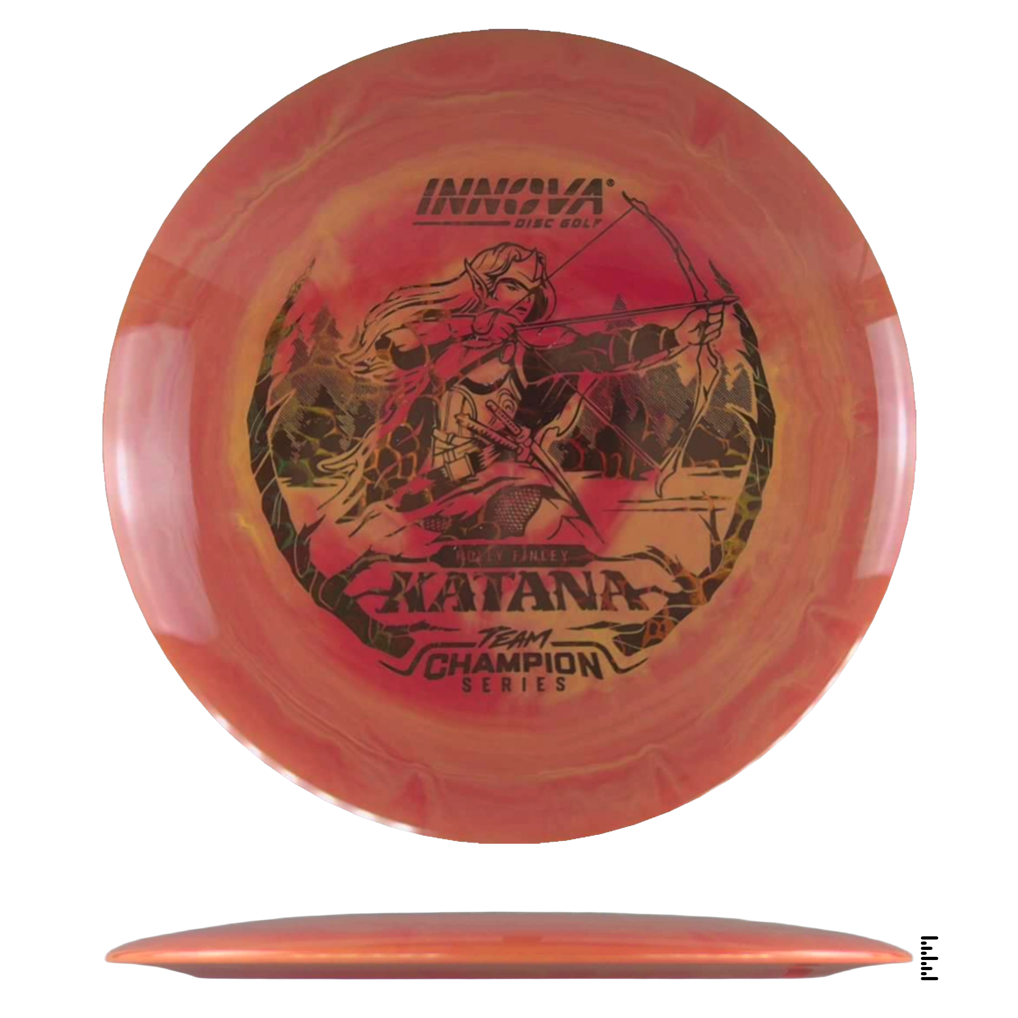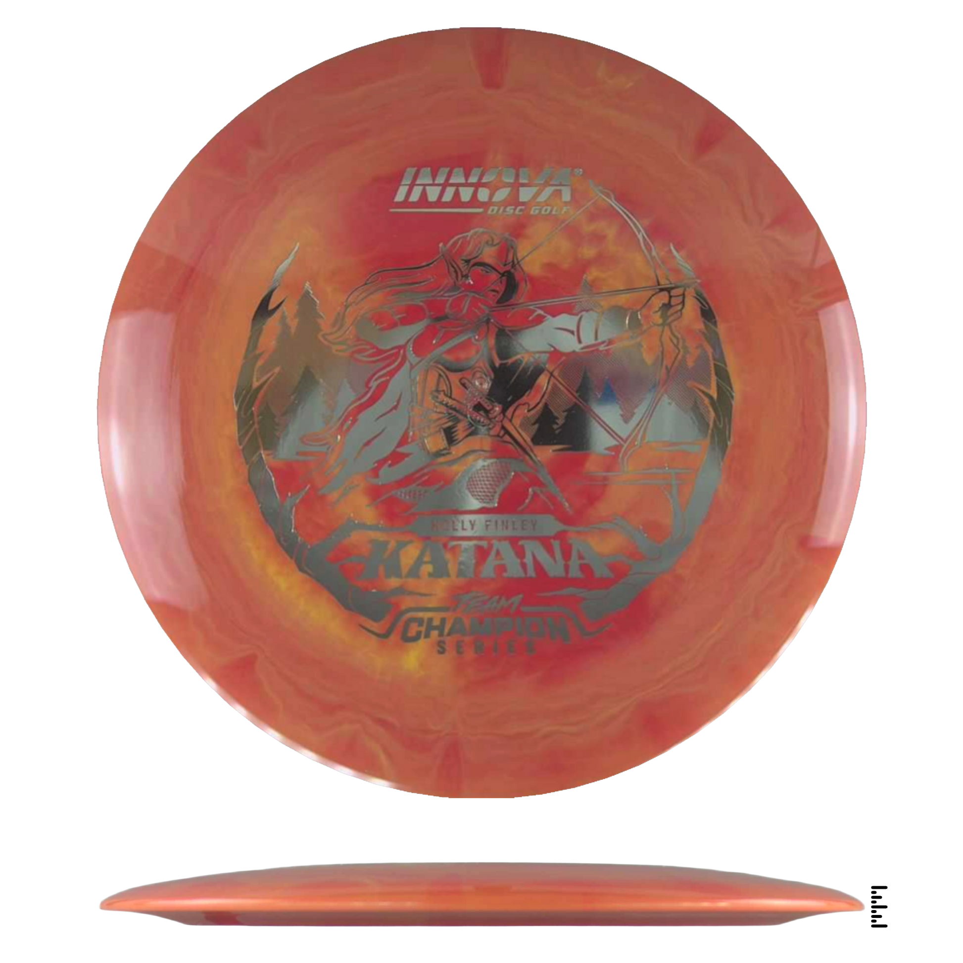 The Katana is a really fast long distance wide-rim driver for those who can control the right release angle. Recommended for tailwinds. Katana is like a Boss with Sidewinder's flight characteristics. This disc gives extra distance for all players.