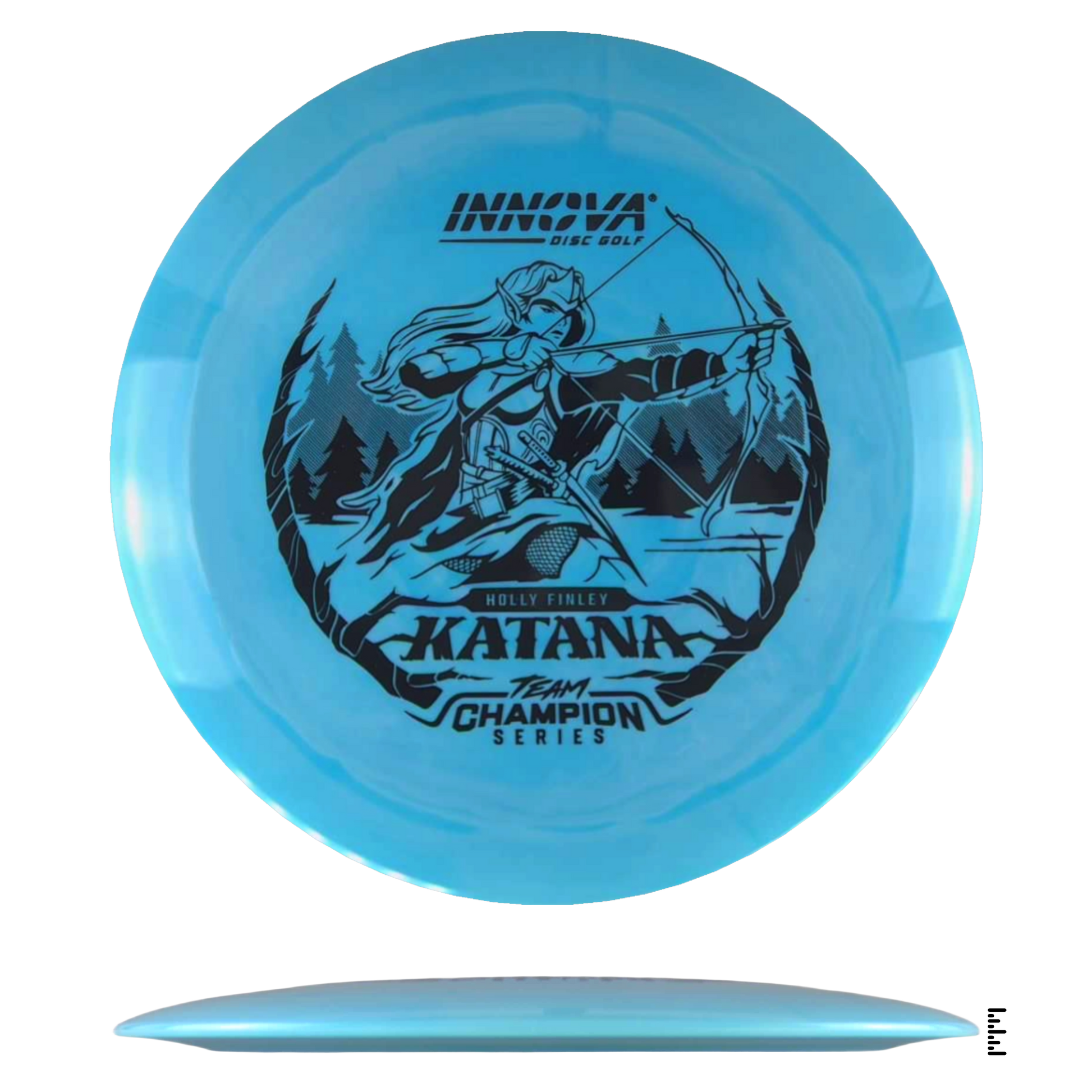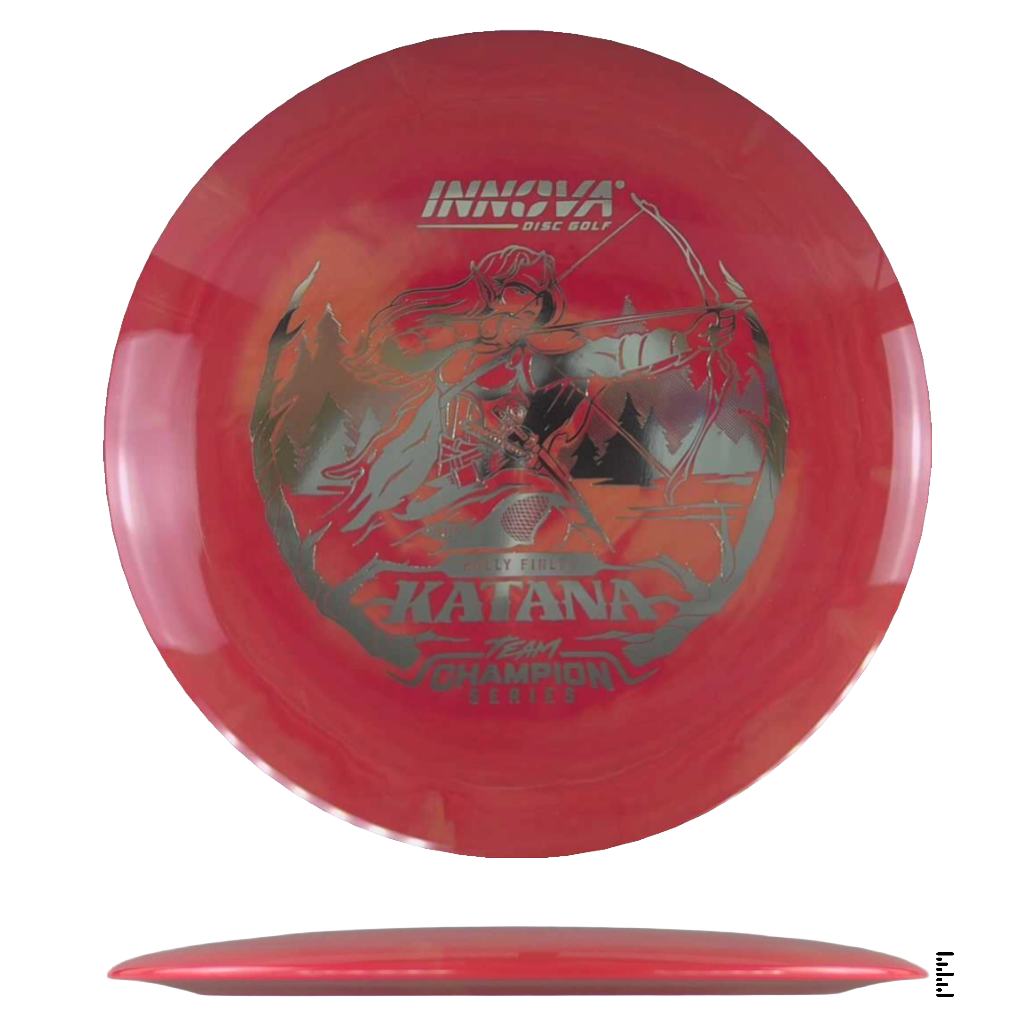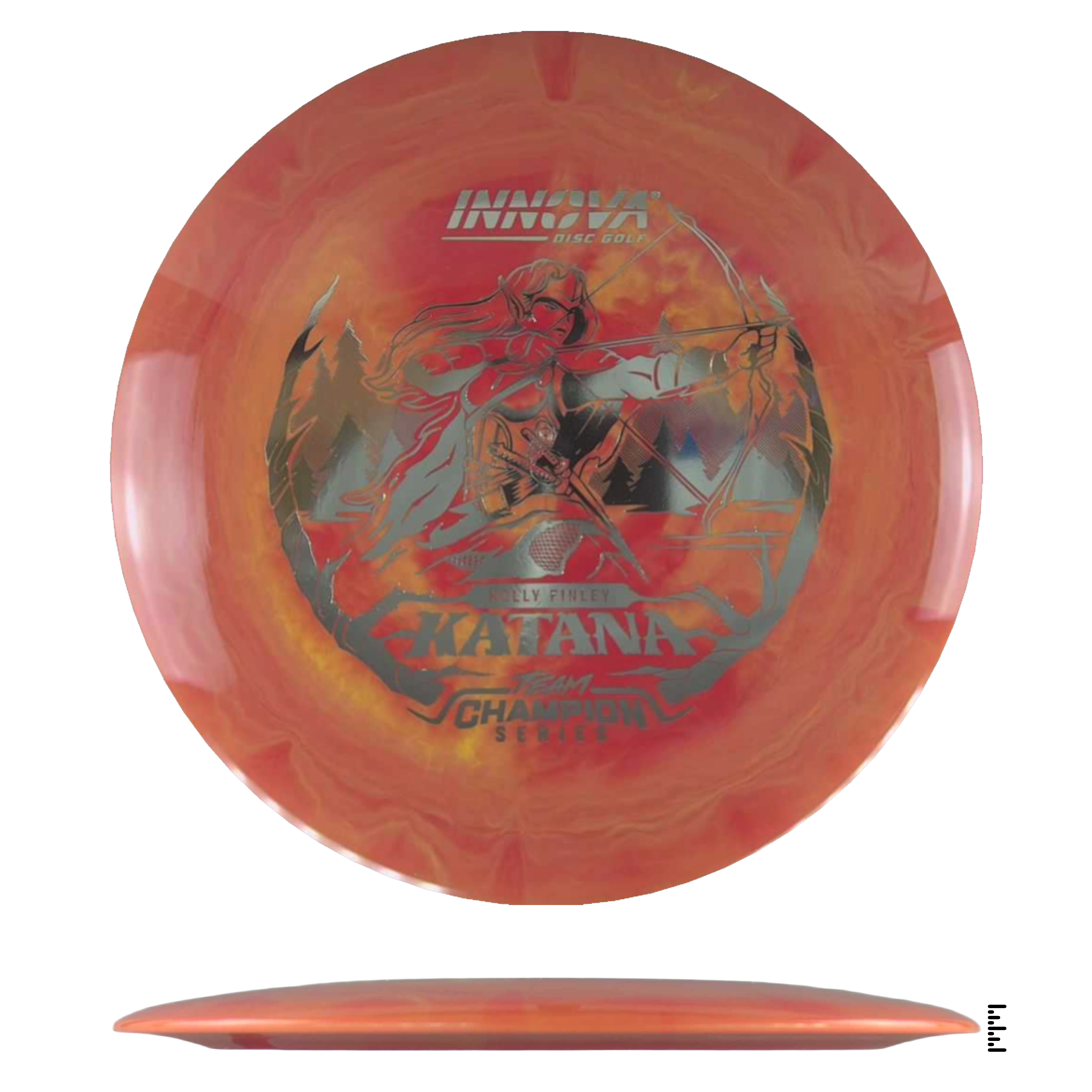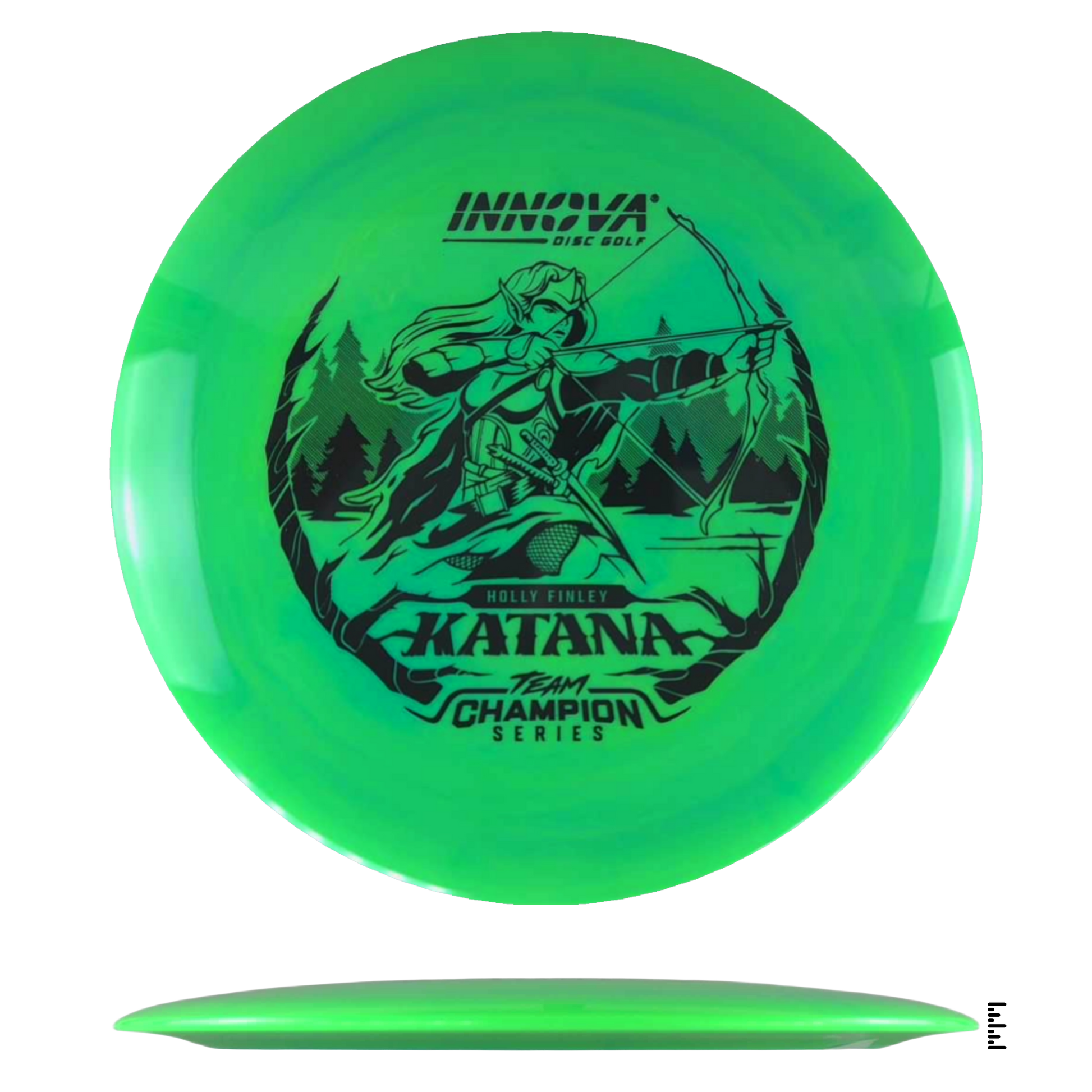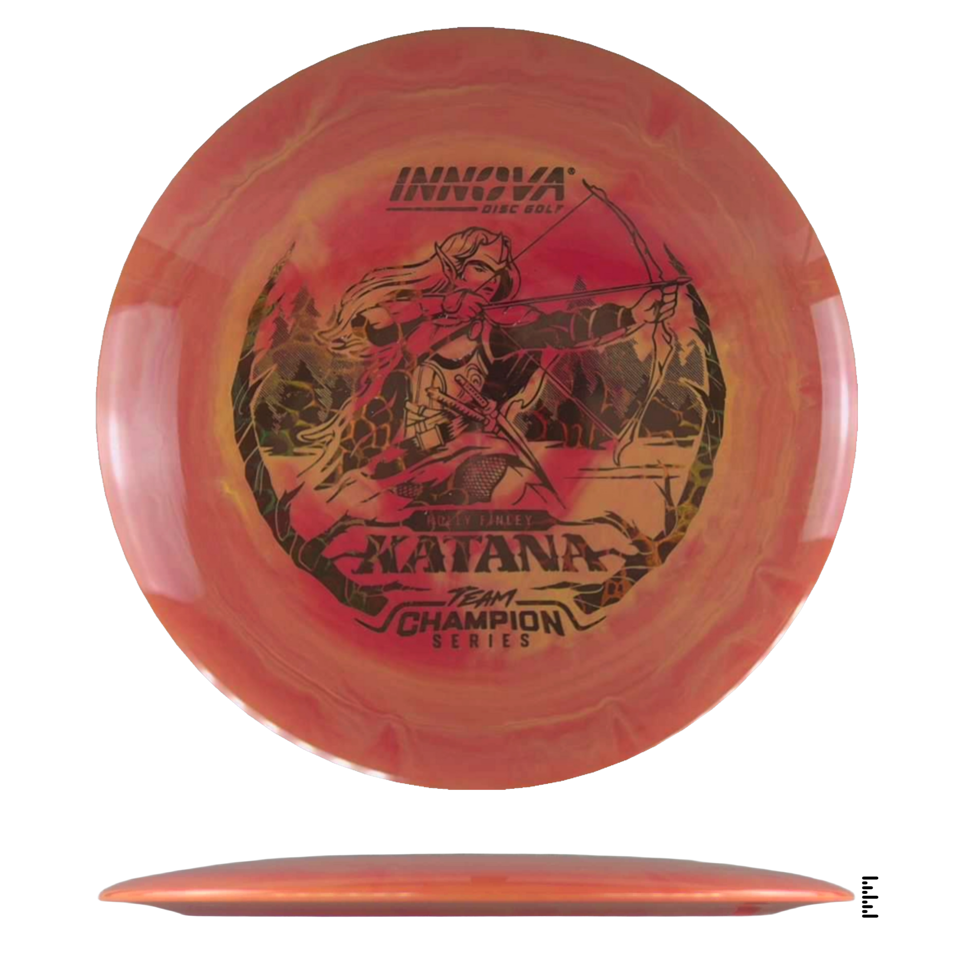 The Katana is a really fast long distance wide-rim driver for those who can control the right release angle. Recommended for tailwinds. Katana is like a Boss with Sidewinder's flight characteristics. This disc gives extra distance for all players.