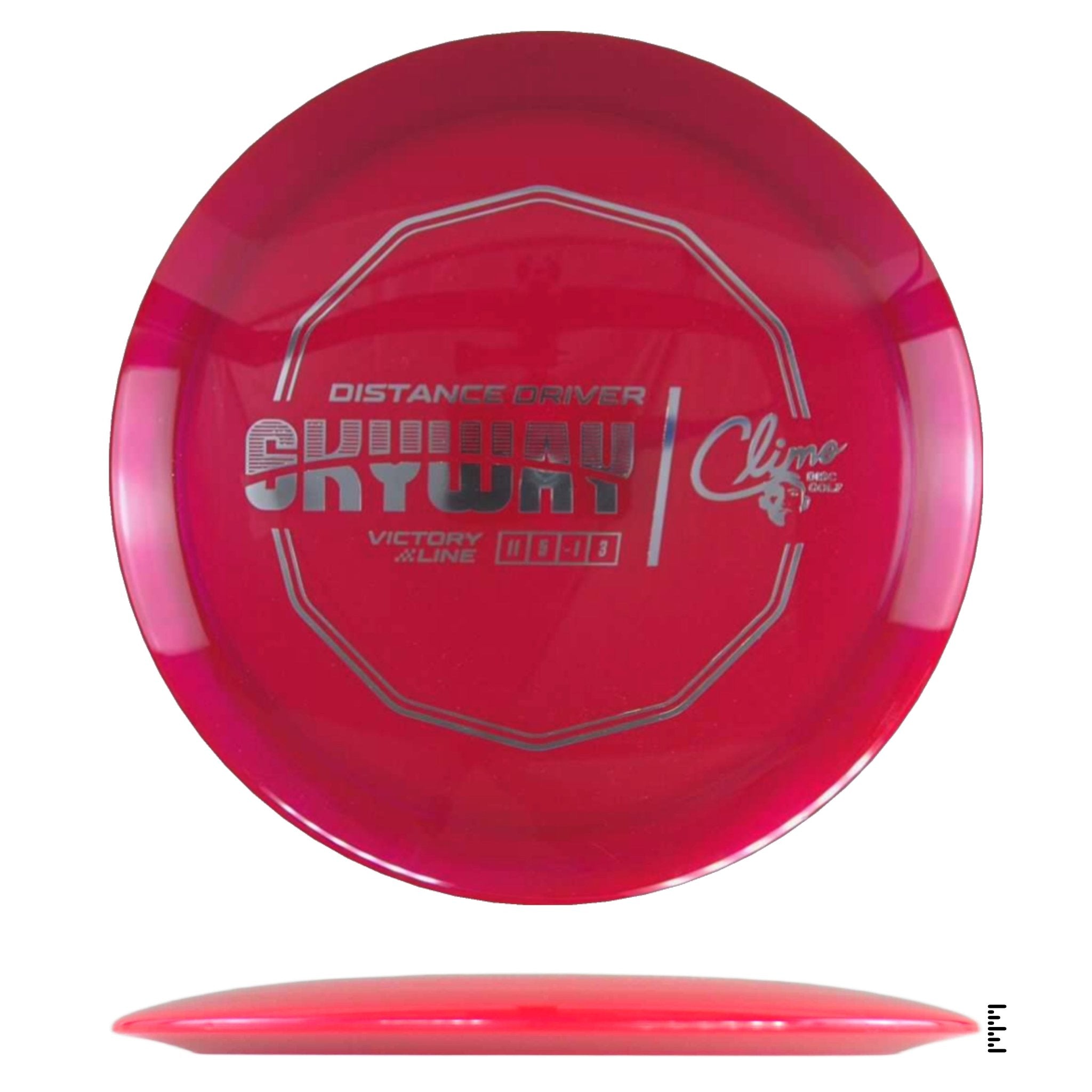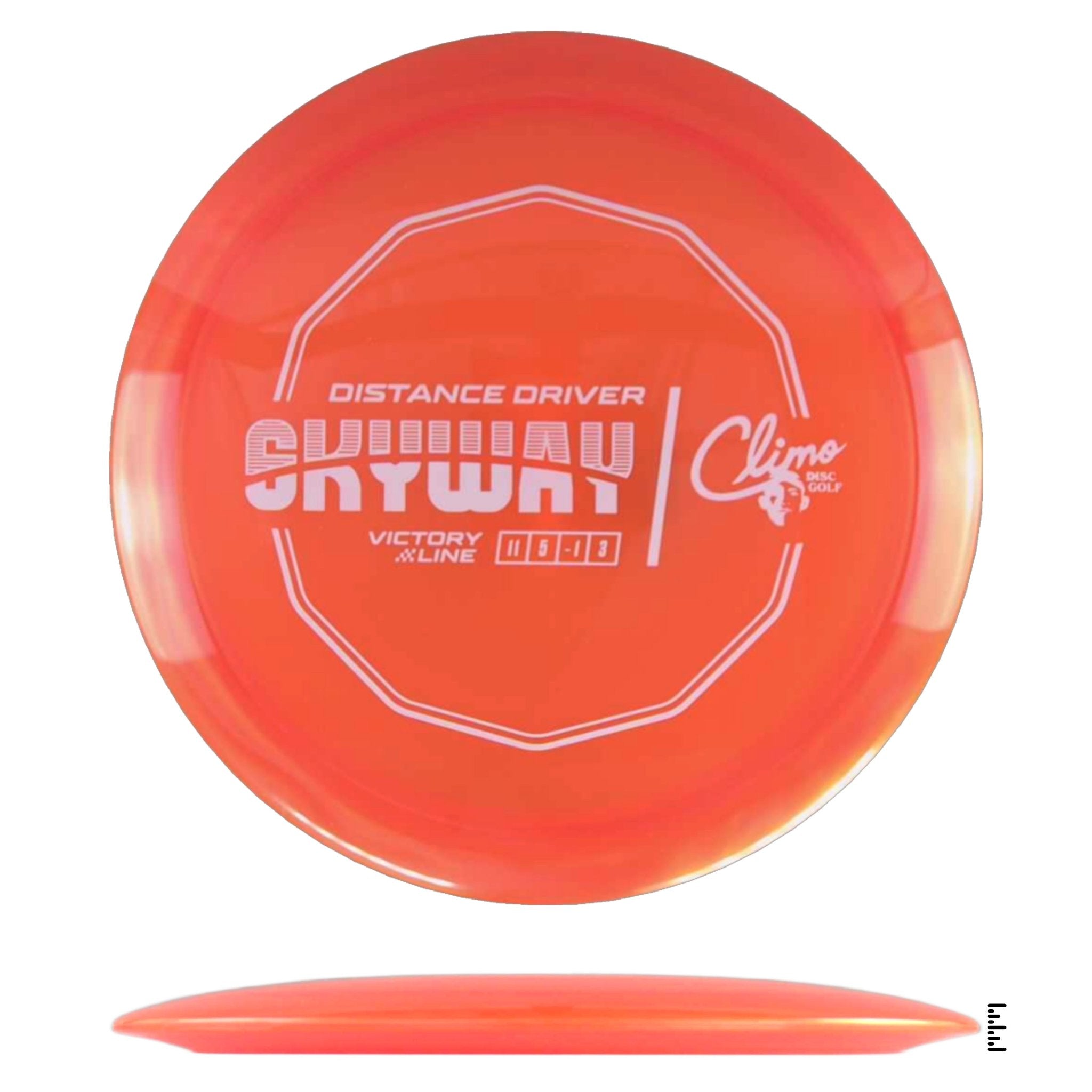 The Climo Disc Golf Skyway is a distance driver with something for all skill levels. There is a hint of overstability in Skyway to give it a trustworthy finish regardless of arm speed. Disc golfers with stronger arms will see just a hint of turn, while still holding up well in headwinds.